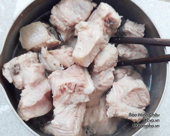 - Sau đó đem sườn chần qua nước sôi rồi rửa lại với nước rồi để ráo.