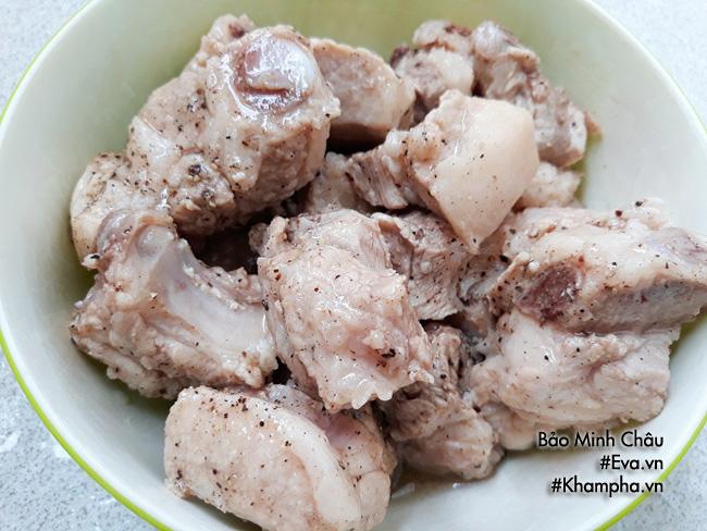 - Sườn đem rửa sạch, chặt miếng vừa ăn. Không nên chặt sườn thành miếng nhỏ quá thì khi nấu, thịt sườn sẽ co lại, trông miếng sườn bé và kém hấp dẫn.