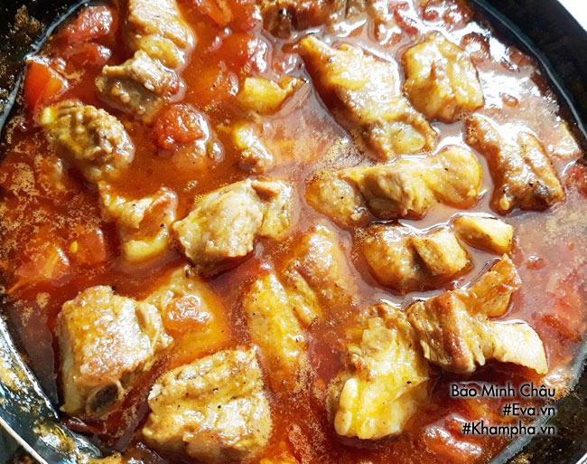 - Đun sôi lên cho cà chua chín nhừ thì cho phần sườn đã chiên ở trên vào. Để lửa nhỏ cho sườn mềm, nước sốt ngấm đều.